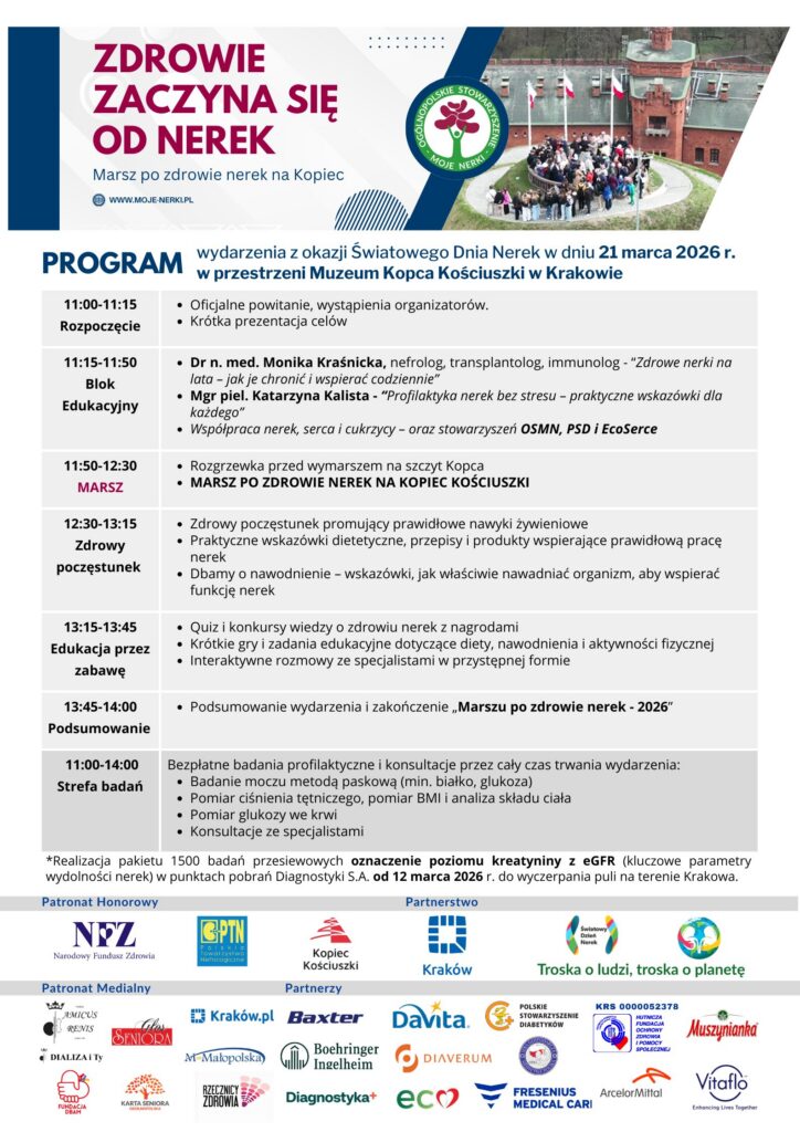 Z okazji Światowego Dnia Nerek zapraszamy do Krakowa na wyjątkowe wydarzenie prozdrowotne „ZDROWIE ZACZYNA SIĘ OD NEREK – Marsz po zdrowie nerek”, które odbędzie się 21 marca 2026 r. w godzinach 11:00–14:00 na terenie Muzeum Kopca Kościuszki w Krakowie (al. Waszyngtona 1). Wejście od strony wejścia do Muzeum.